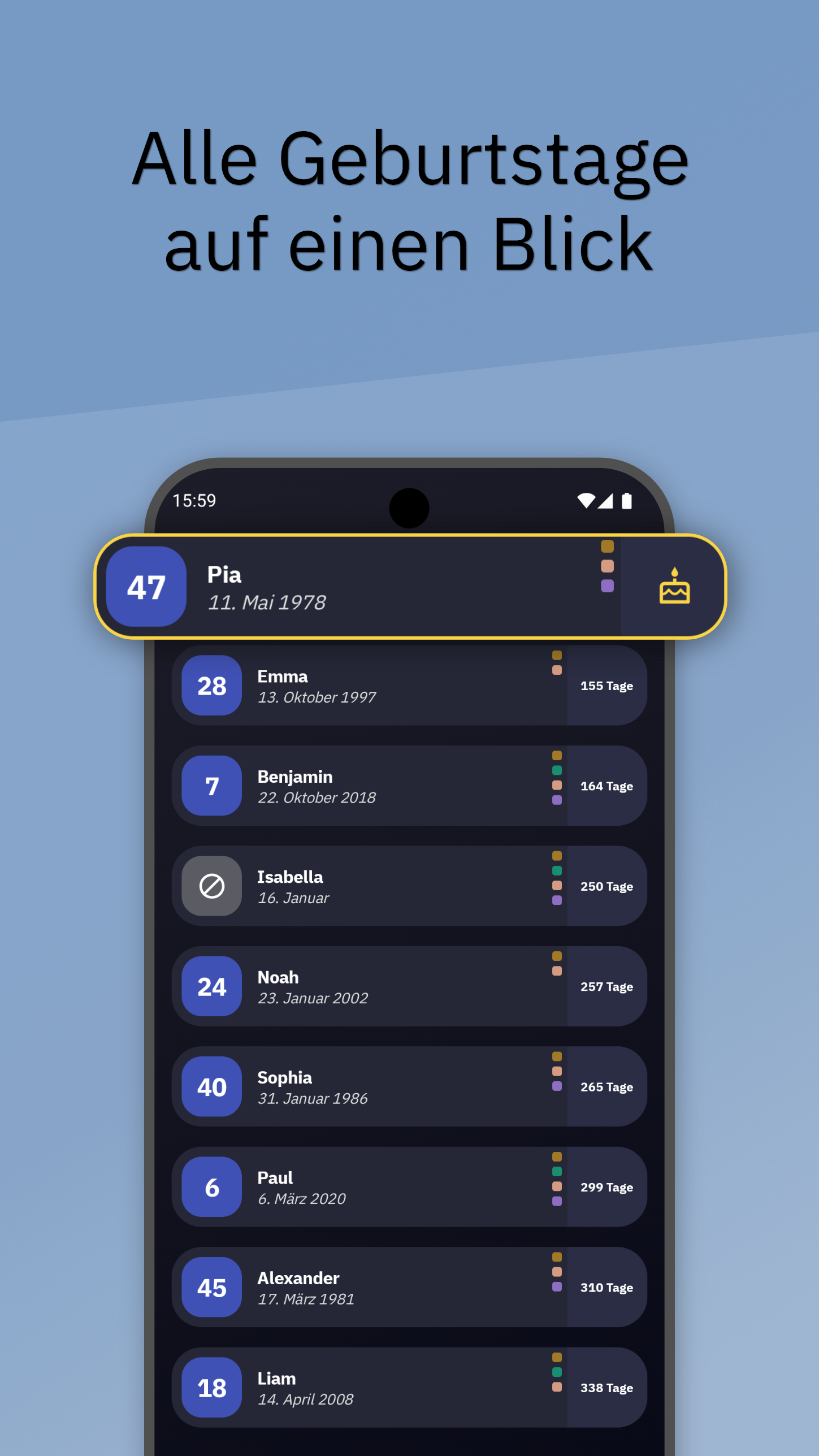 Mit der Vollversion entfallen diese Grenzen und du kannst beliebig viele Geburtstage und Erinnerungen speichern.